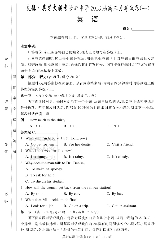 【英語】炎德英才大聯(lián)考2018長郡中學(xué)高三1次月考