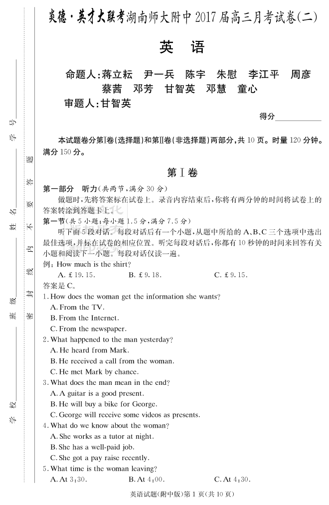 【英語】炎德英才大聯(lián)考2017師大附中高三2次月考