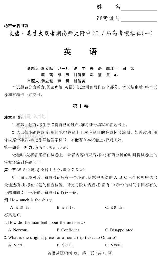 【英語】炎德英才大聯(lián)考2017師大附中高三8次月考(模擬一)