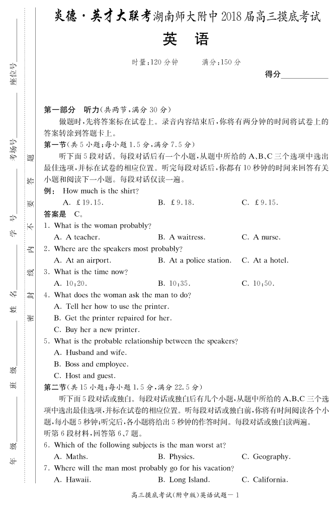 【英語】炎德英才大聯(lián)考2018師大附中高三入學(xué)摸底考試