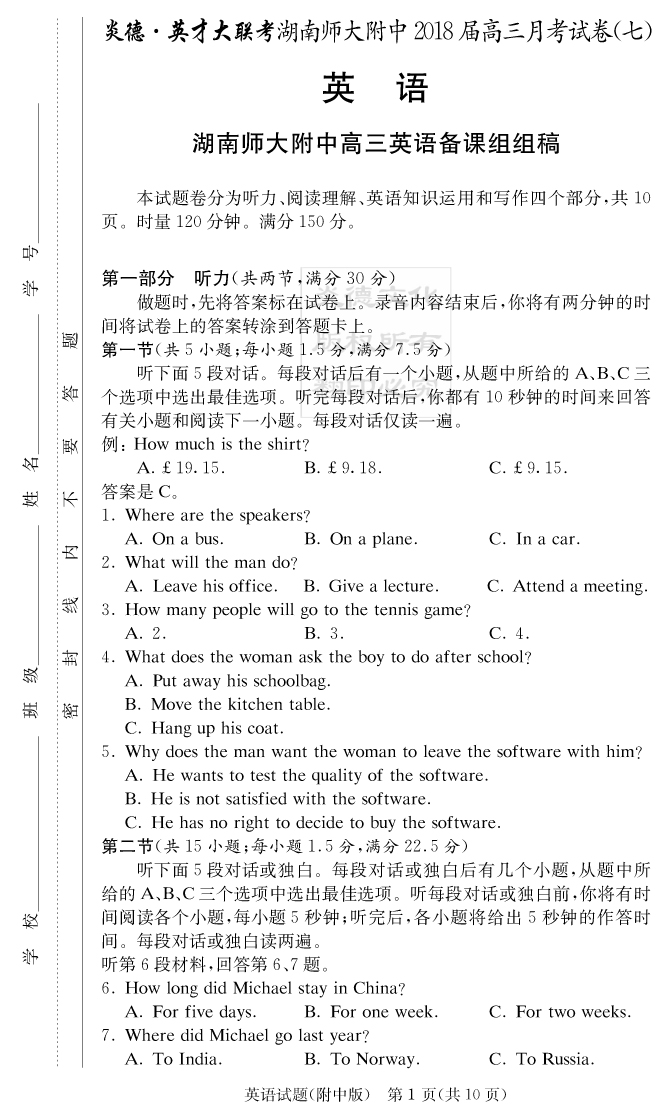 【英語】炎德英才大聯(lián)考2018師大附中高三7次月考