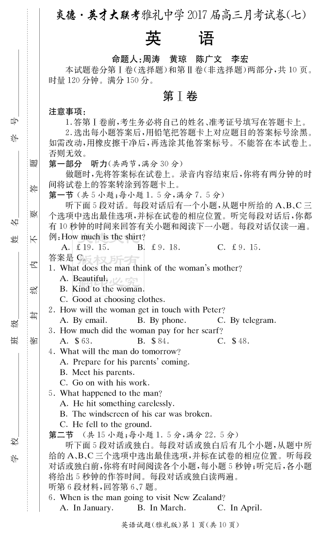 【英語】炎德英才大聯(lián)考2017雅禮中學(xué)高三7次月考