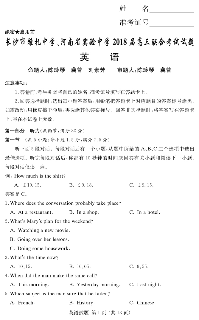 【英語(yǔ)】炎德英才大聯(lián)考2018雅禮中學(xué)高三9次月考