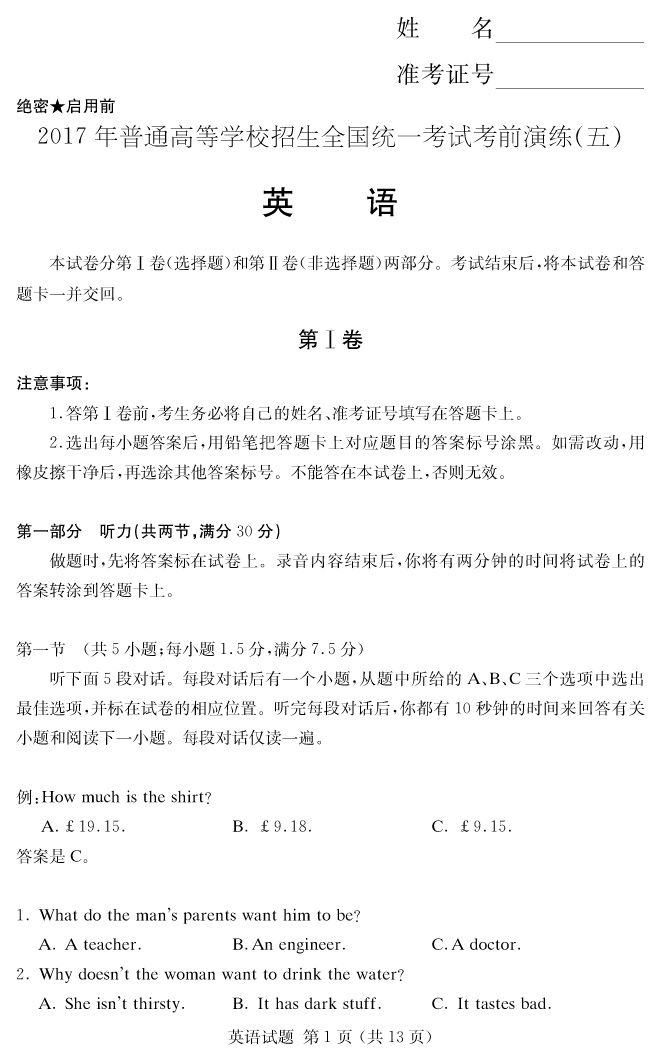 【英語】2017年普通高等學(xué)校招生全國統(tǒng)一考試考前演練(五)