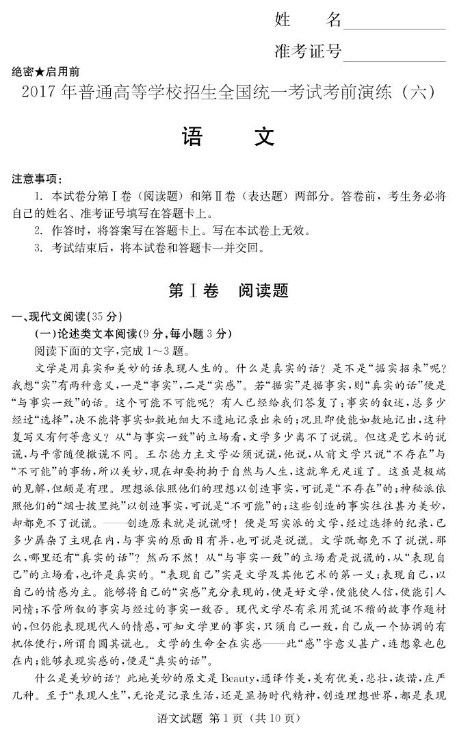 【語(yǔ)文】2017年普通高等學(xué)校招生全國(guó)統(tǒng)一考試考前演練(六)