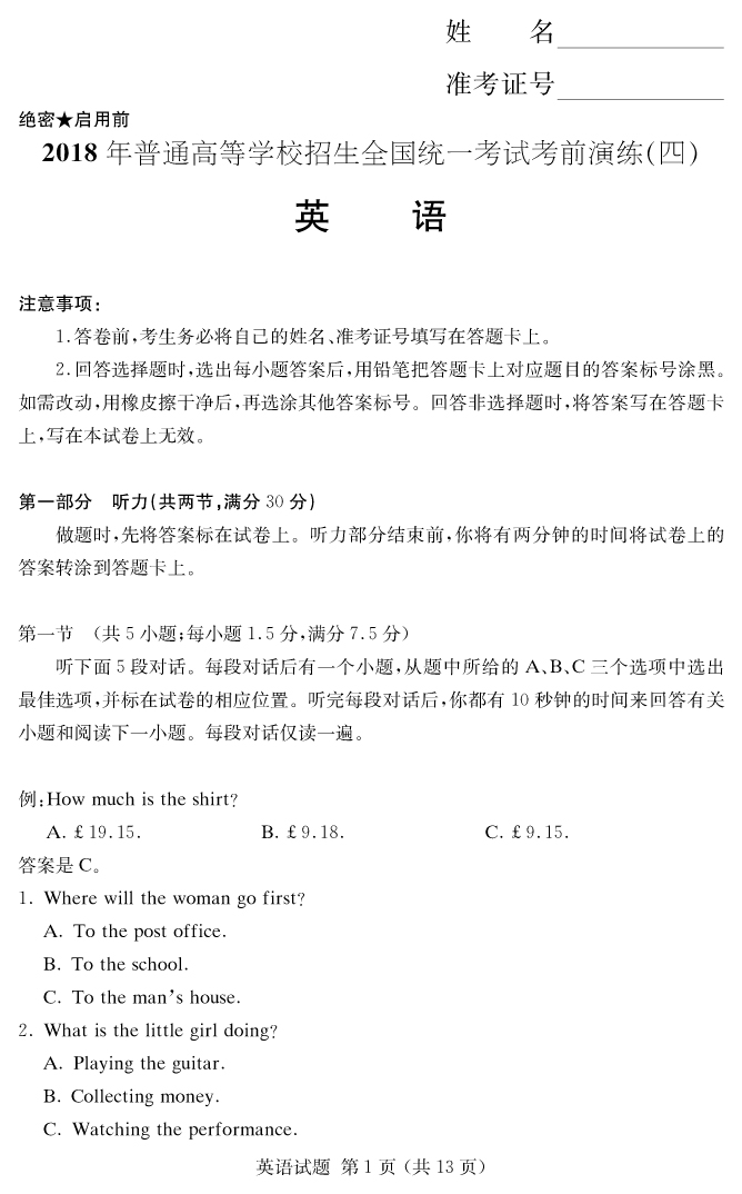 【英語】2018年普通高等學(xué)校招生全國統(tǒng)一考試考前演練(四)