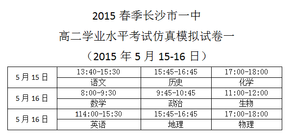2015春季長沙市一中高二學(xué)業(yè)水平考試仿真模擬試卷一考試時間安排(2015年5月15-16日)