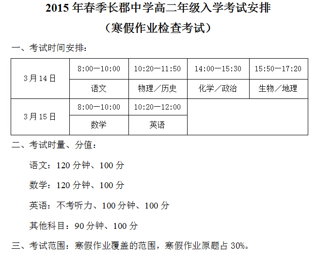 2015年春長郡中學(xué)高二入學(xué)考試安排(寒假作業(yè)檢測)