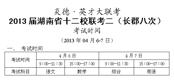 炎德英才大聯(lián)考2013屆湖南省十二校聯(lián)考二(長郡八次)考試時(shí)間