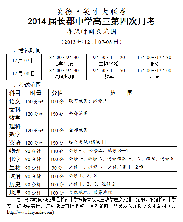 炎德英才大聯(lián)考長(zhǎng)郡中學(xué)2014屆高三第4次月考考試時(shí)間和范圍(2013.12.07-08)