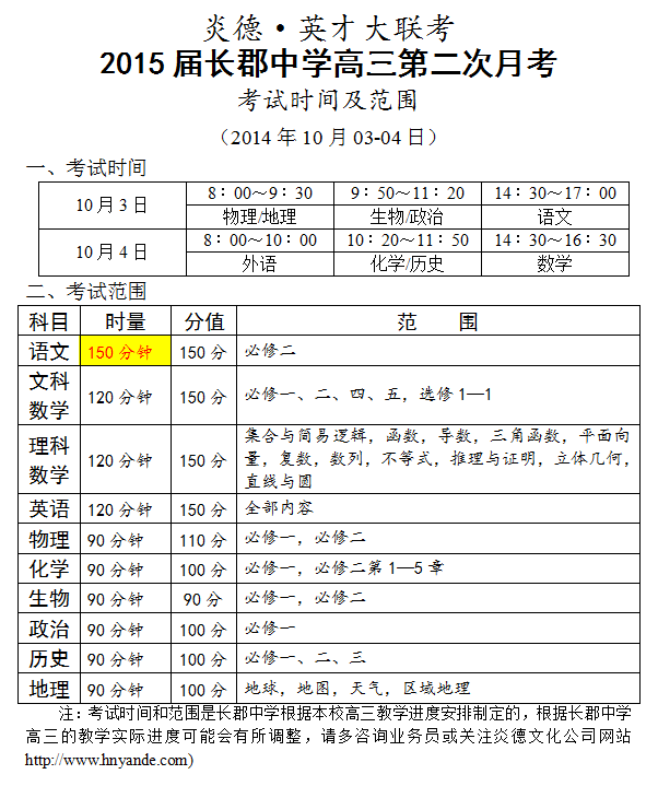 炎德英才大聯(lián)考長(zhǎng)郡中學(xué)2015屆高三第2次月考考試時(shí)間和范圍(2014.10.03-04)