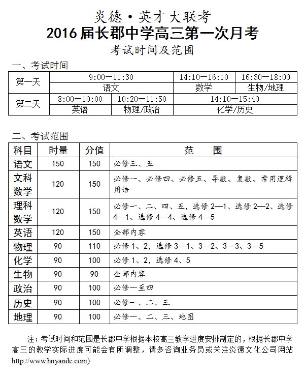 炎德英才大聯(lián)考長郡中學(xué)2016屆高三第1次月考考試時間和范圍