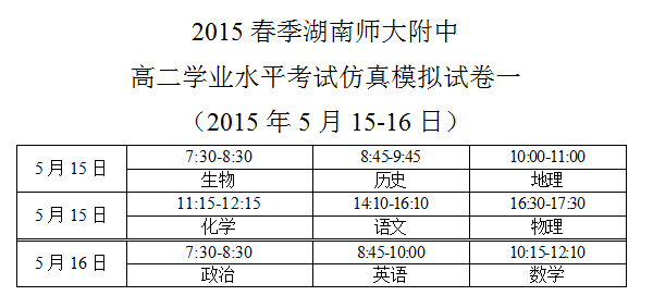 2015春季師大附中高二學(xué)業(yè)水平考試仿真模擬試卷一考試時(shí)間安排(2015年5月15-16日)