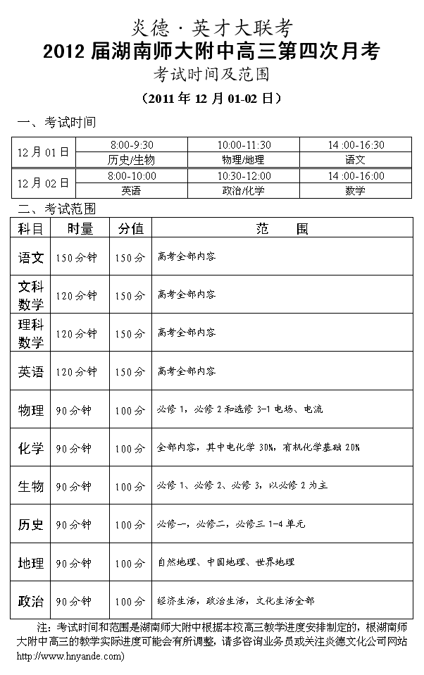 炎德英才大聯(lián)考湖南師大附中2012屆高三第四次月考考試時(shí)間和范圍