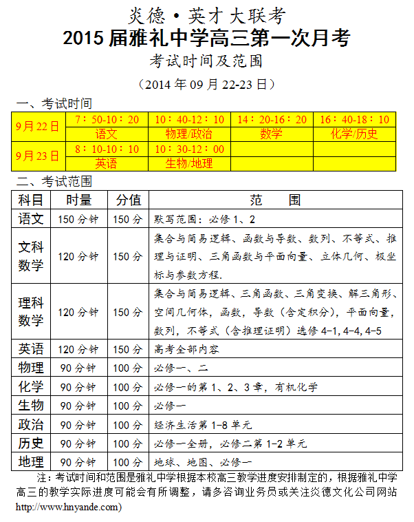 炎德英才大聯(lián)考雅禮中學(xué)2015屆高三第1次月考考試時(shí)間和范圍(2014.09.22-23)