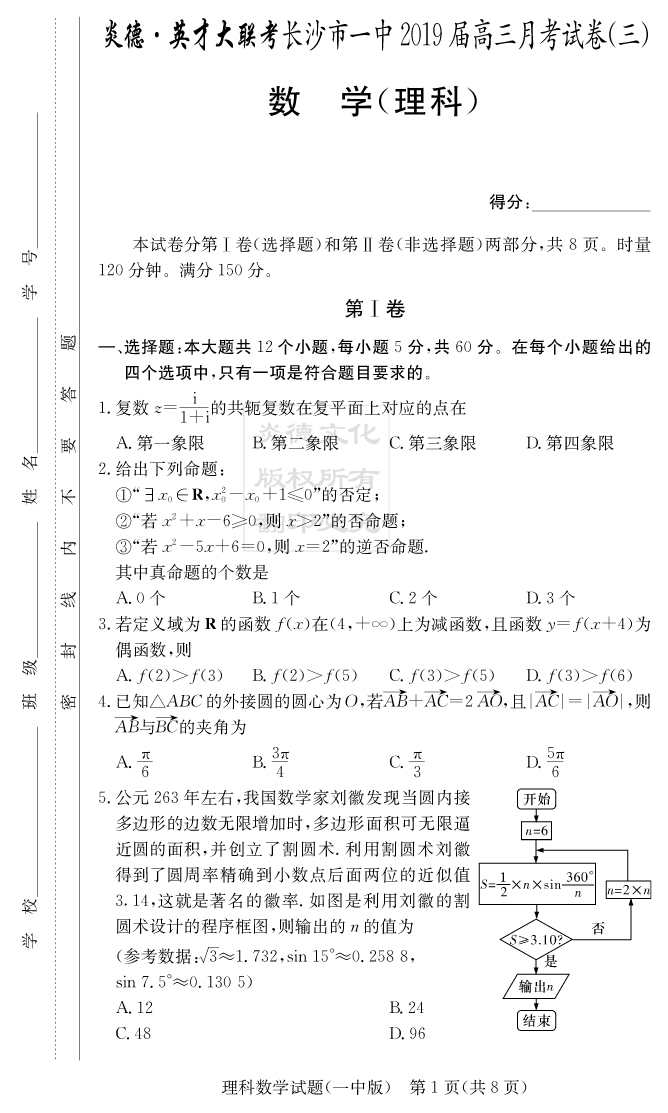【理數(shù)】炎德英才大聯(lián)考2019長沙一中高三3次月考