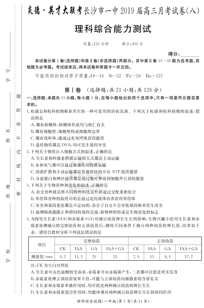 【理綜】炎德英才大聯(lián)考2019長沙一中高三8次月考