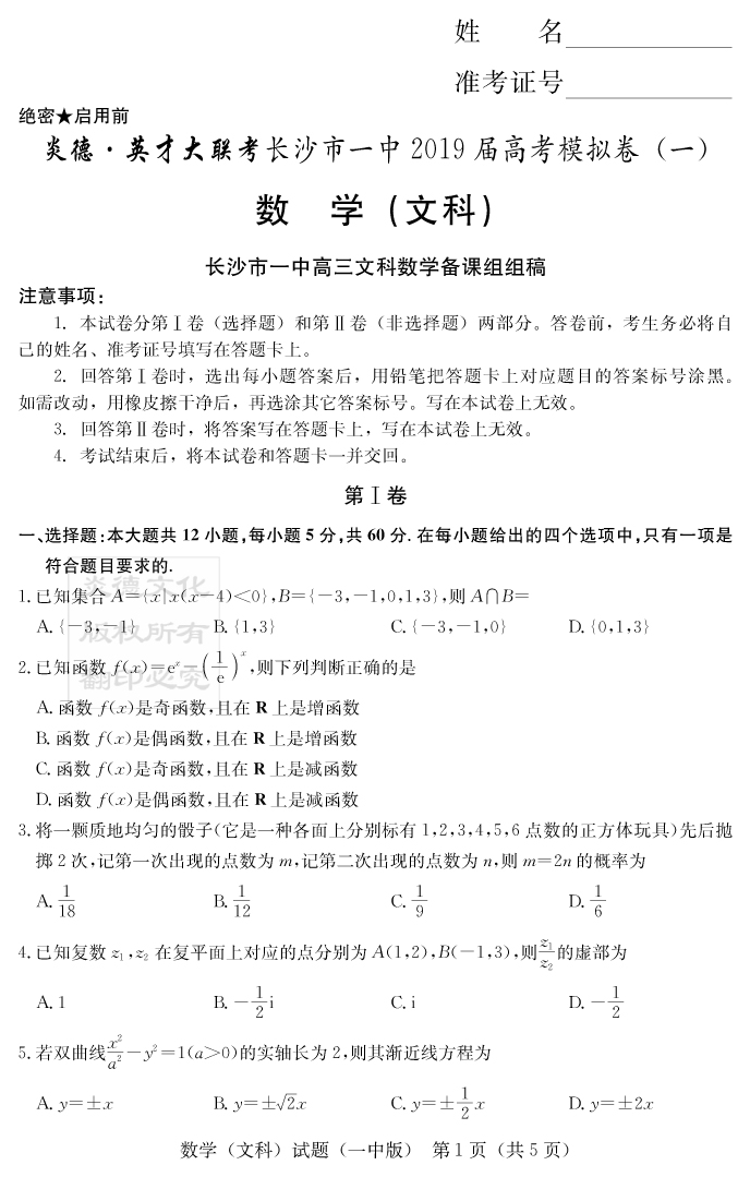 【文數(shù)】炎德英才大聯(lián)考2019長沙一中高三10次月考(模擬一)