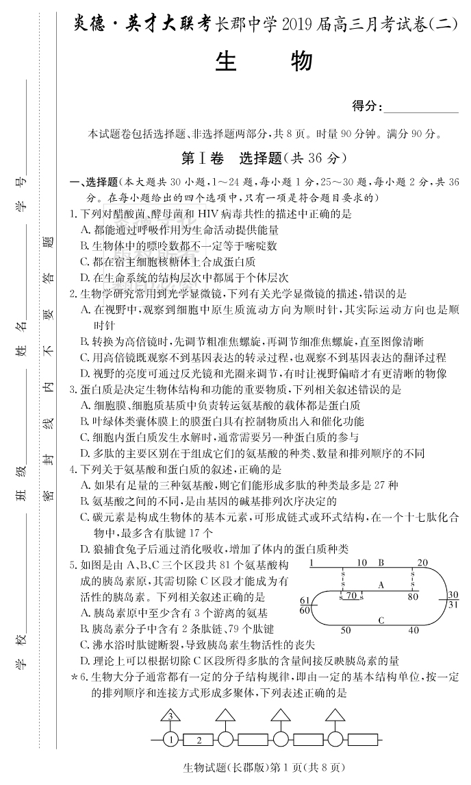 【生物】炎德英才大聯(lián)考2019長(zhǎng)郡中學(xué)高三2次月考
