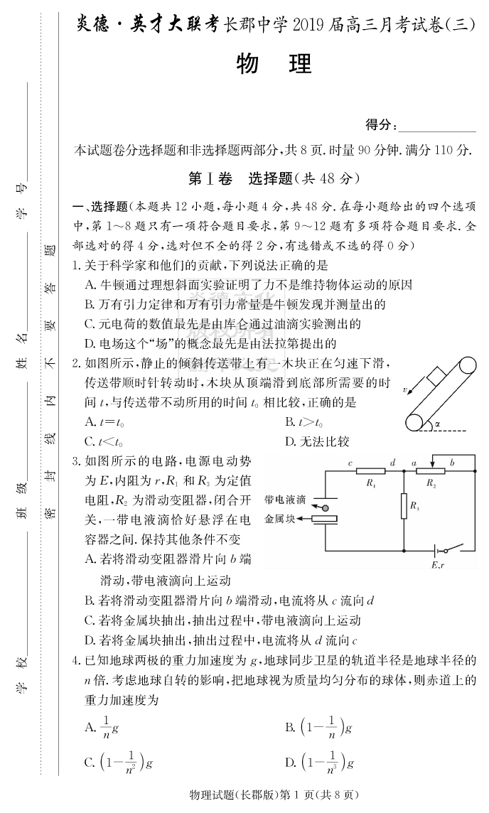 【物理】炎德英才大聯(lián)考2019長郡中學(xué)高三3次月考