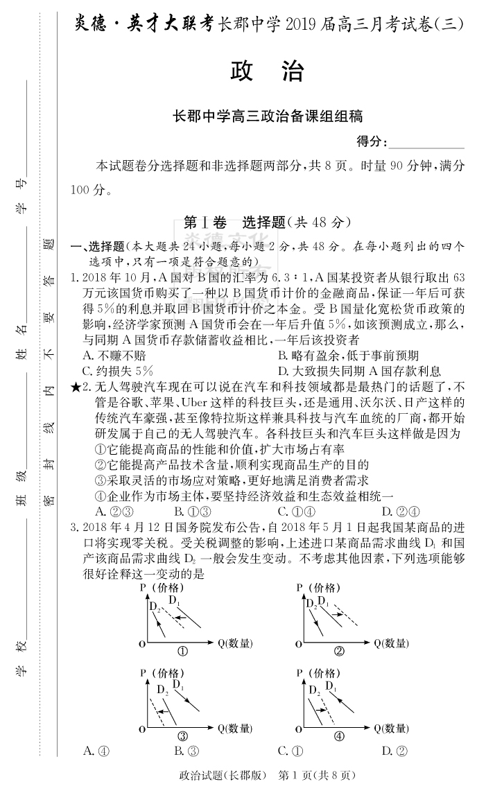 【政治】炎德英才大聯(lián)考2019長郡中學(xué)高三3次月考