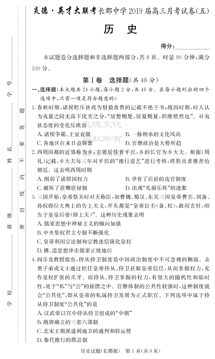【歷史】炎德英才大聯(lián)考2019長(zhǎng)郡中學(xué)高三5次月考