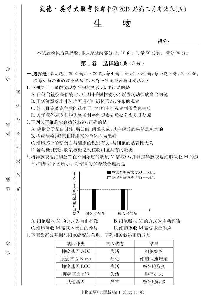 【生物】炎德英才大聯(lián)考2019長(zhǎng)郡中學(xué)高三5次月考