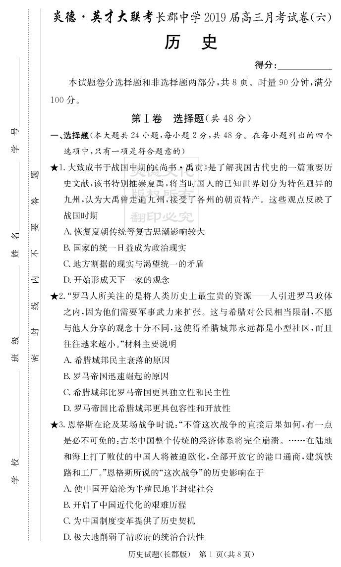 【歷史】炎德英才大聯(lián)考2019長郡中學(xué)高三6次月考