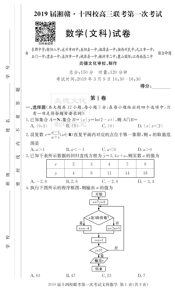 【文數(shù)】炎德英才大聯(lián)考2019長(zhǎng)郡中學(xué)高三7次月考(十四校聯(lián)考一)