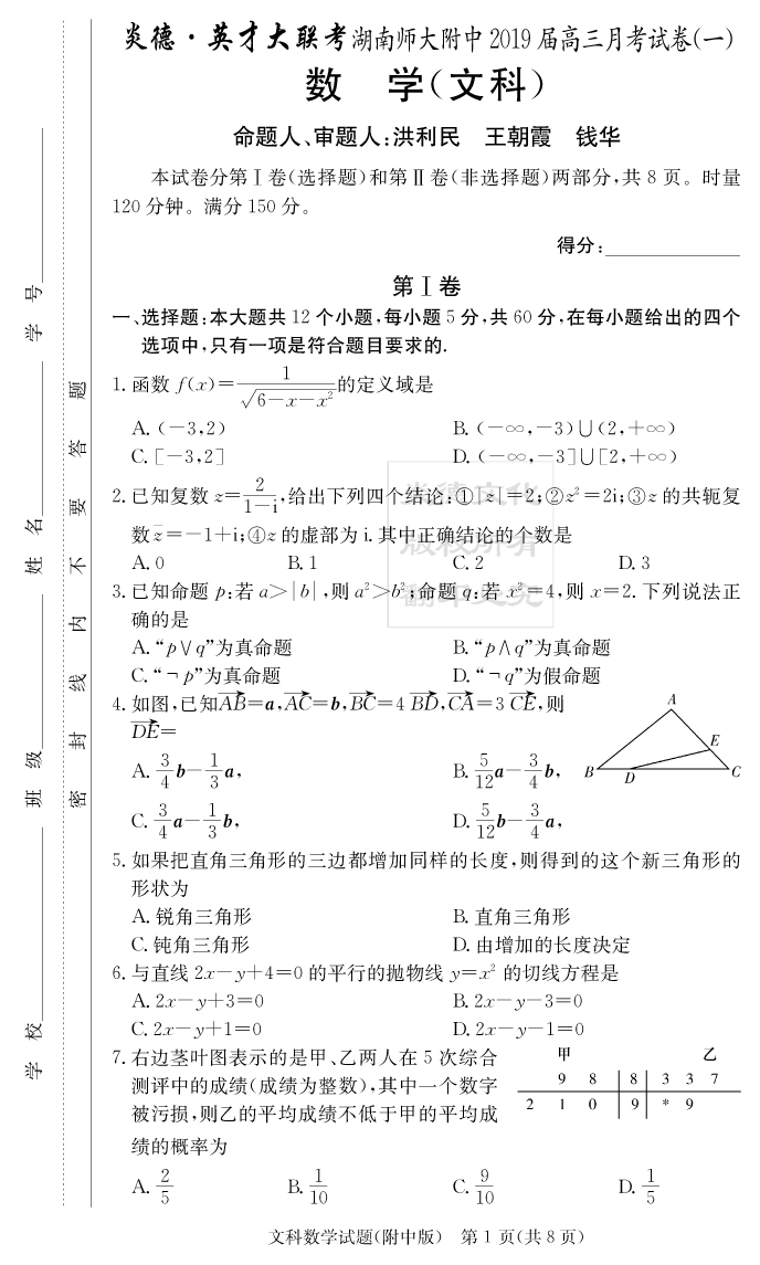 【文數(shù)】炎德英才大聯(lián)考2019師大附中高三1次月考