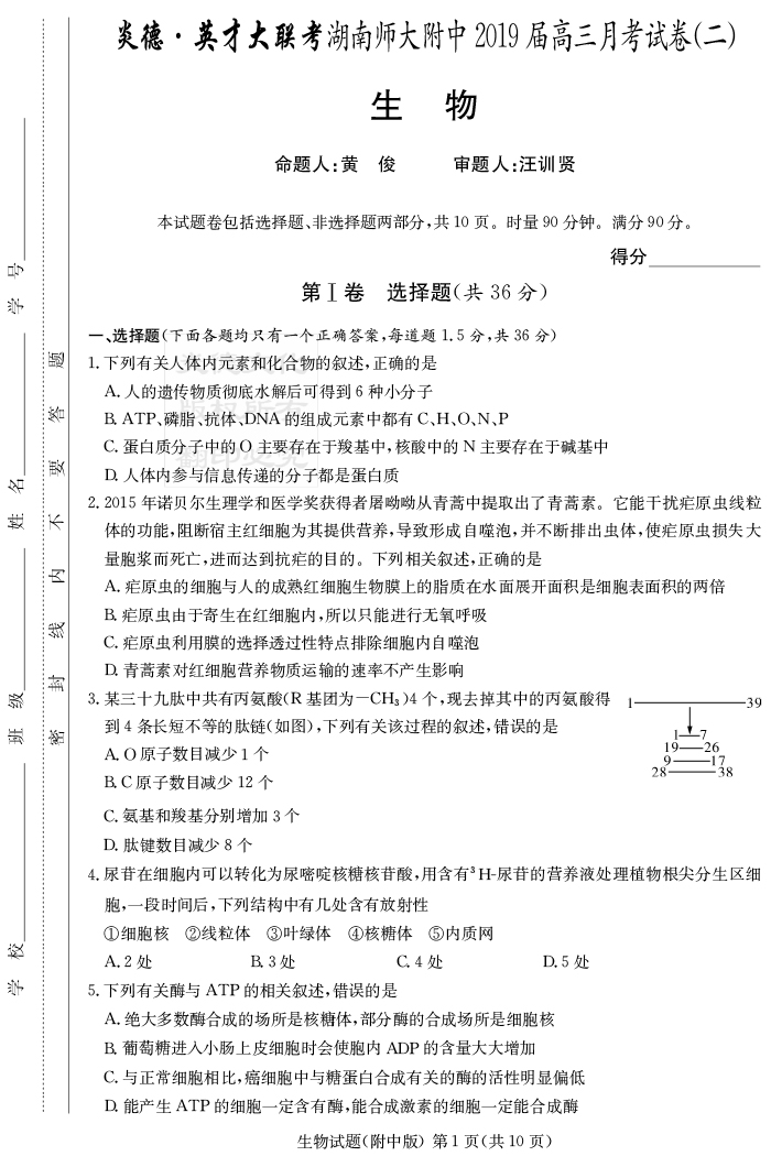【生物】炎德英才大聯(lián)考2019師大附中高三2次月考