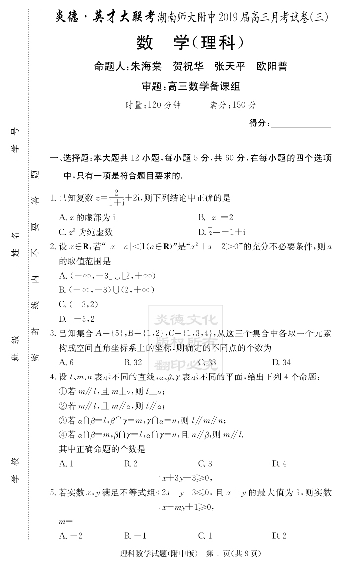 【理數(shù)】炎德英才大聯(lián)考2019師大附中高三3次月考