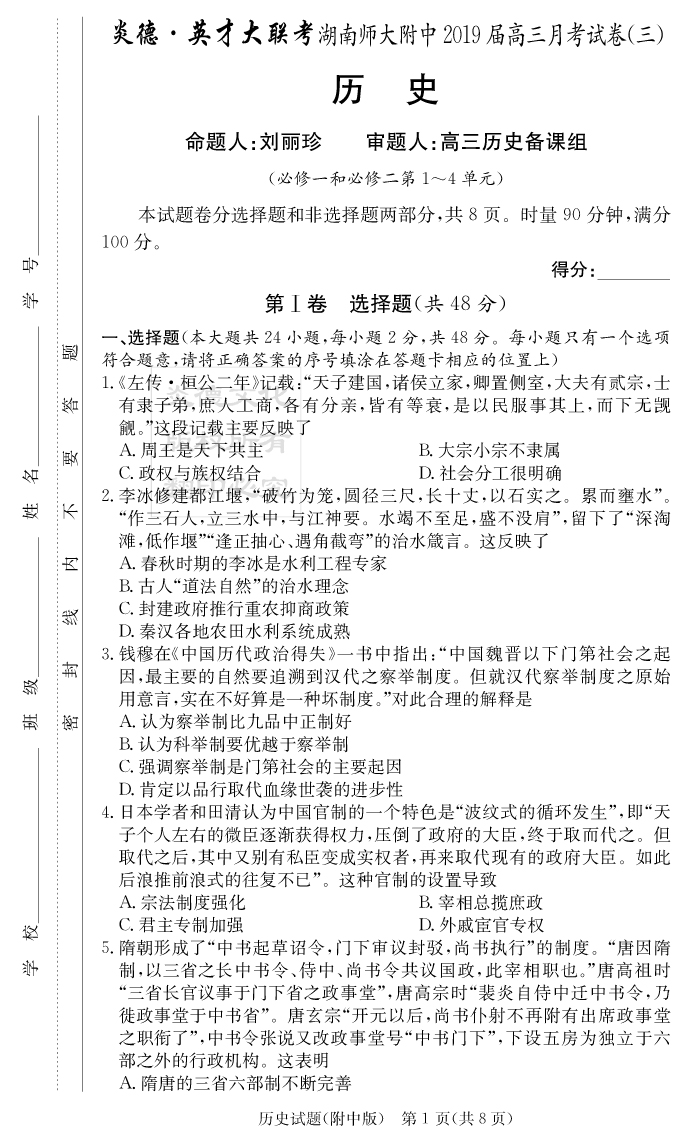 2026湖南師大附中新高考考前小題訓練·歷史
