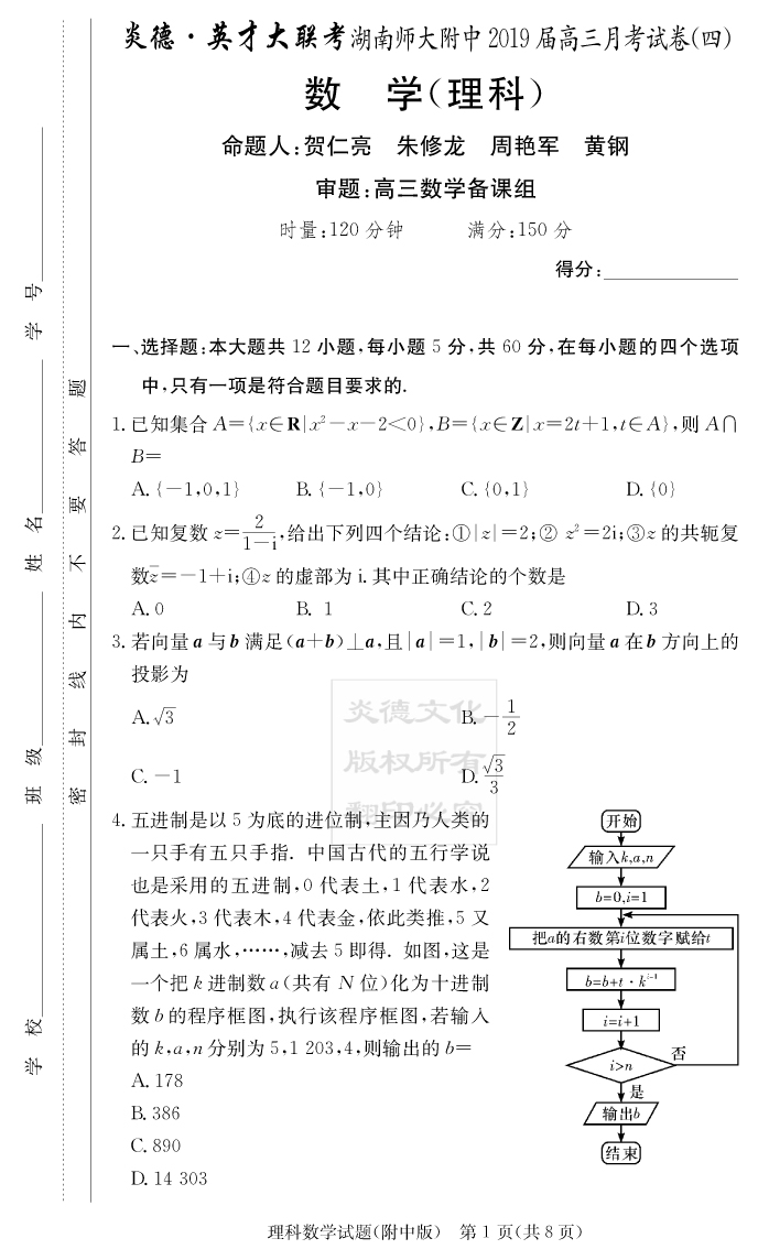 【理數(shù)】炎德英才大聯(lián)考2019師大附中高三4次月考
