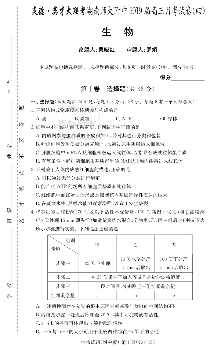 【生物】炎德英才大聯(lián)考2019師大附中高三4次月考