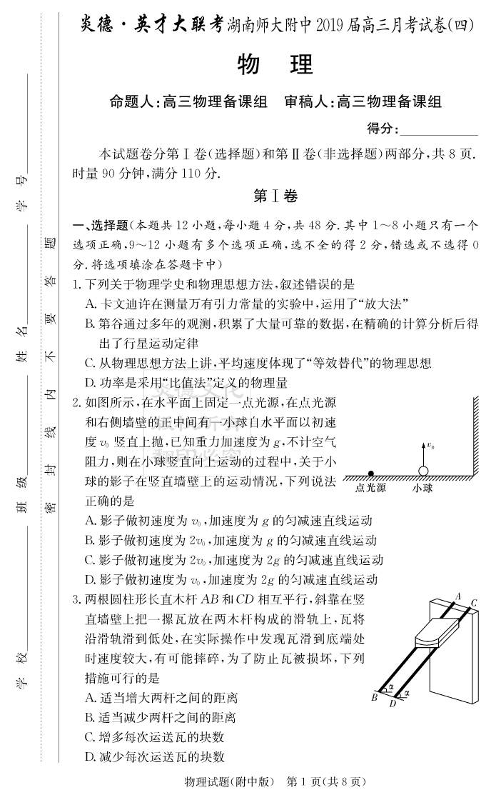 【物理】炎德英才大聯(lián)考2019師大附中高三4次月考