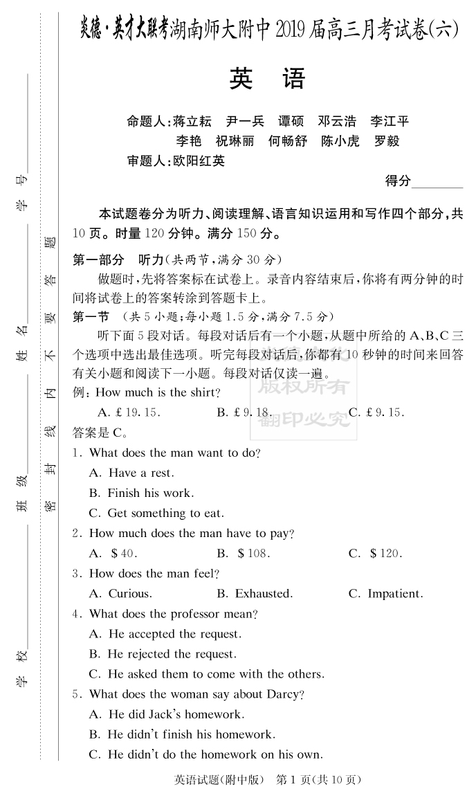 【英語】炎德英才大聯(lián)考2019師大附中高三6次月考