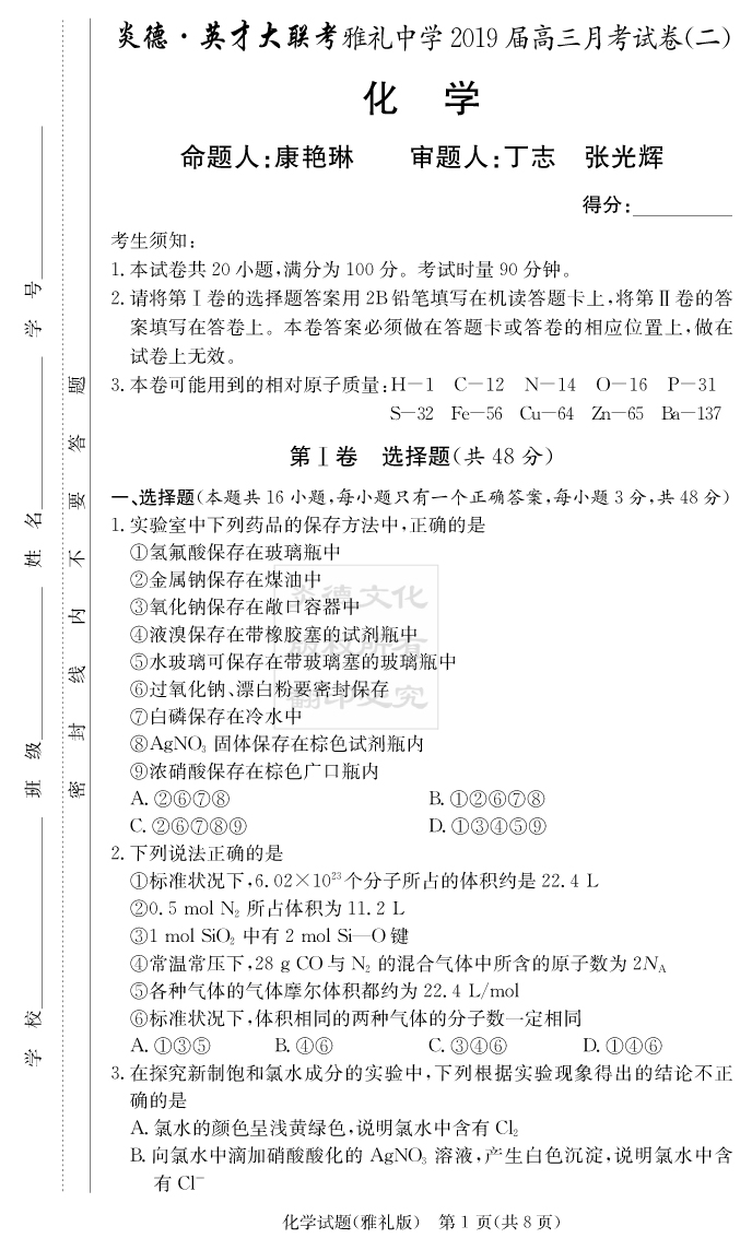 【化學(xué)】炎德英才大聯(lián)考2019雅禮中學(xué)高三2次月考