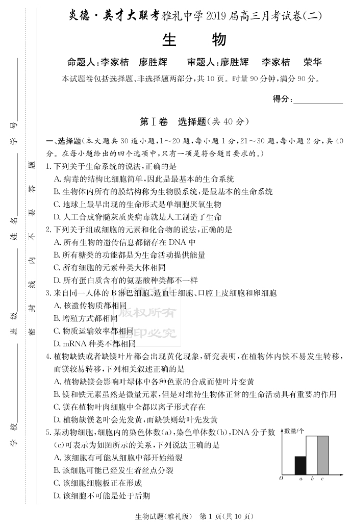 【生物】炎德英才大聯(lián)考2019雅禮中學(xué)高三2次月考
