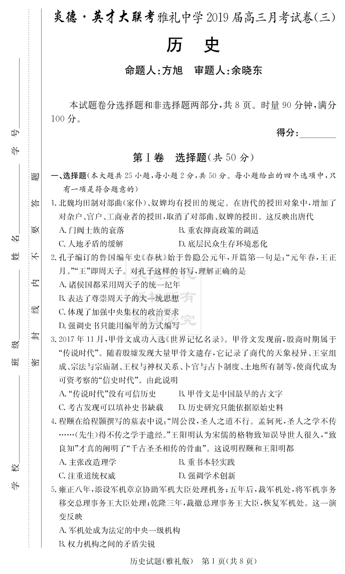 【歷史】炎德英才大聯(lián)考2019雅禮中學(xué)高三3次月考
