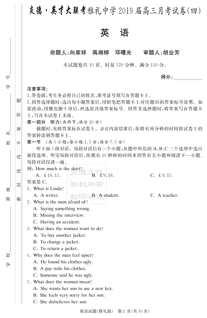【英語】炎德英才大聯(lián)考2019雅禮中學(xué)高三4次月考