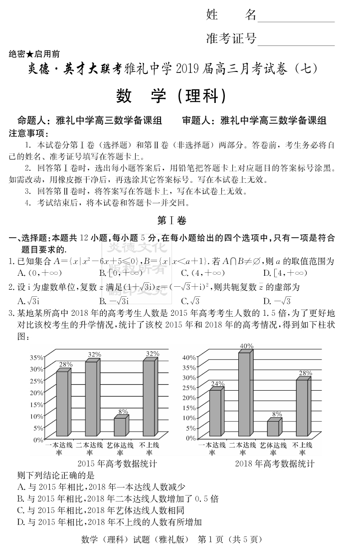 【理數(shù)】炎德英才大聯(lián)考2019雅禮中學(xué)高三7次月考