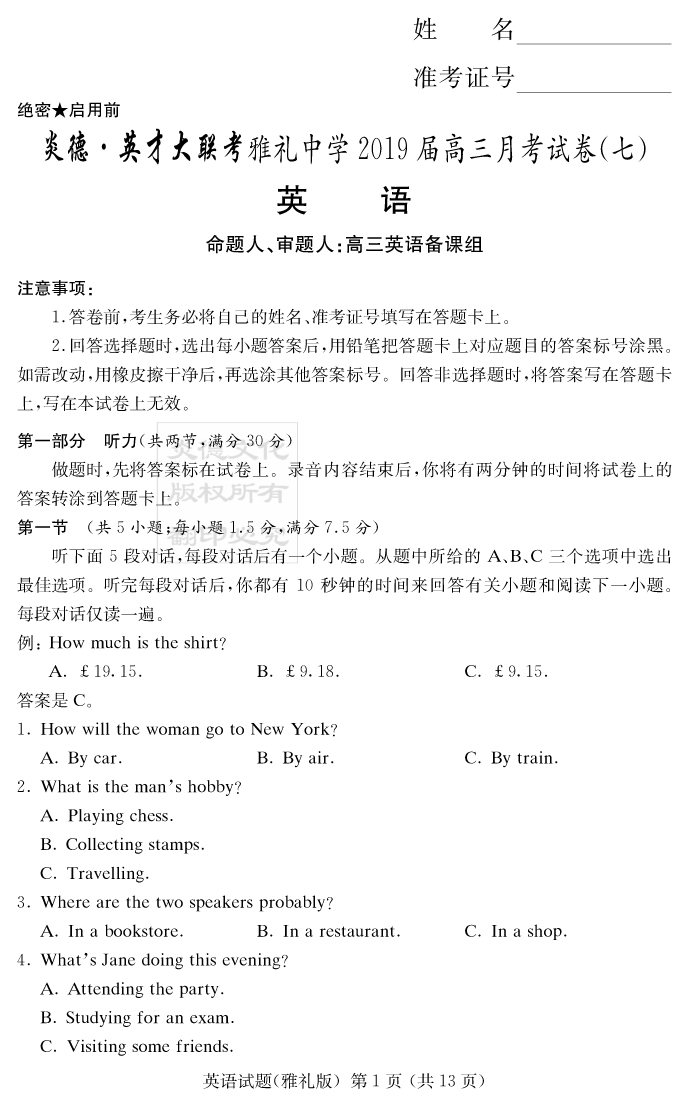 【英語(yǔ)】炎德英才大聯(lián)考2019雅禮中學(xué)高三7次月考