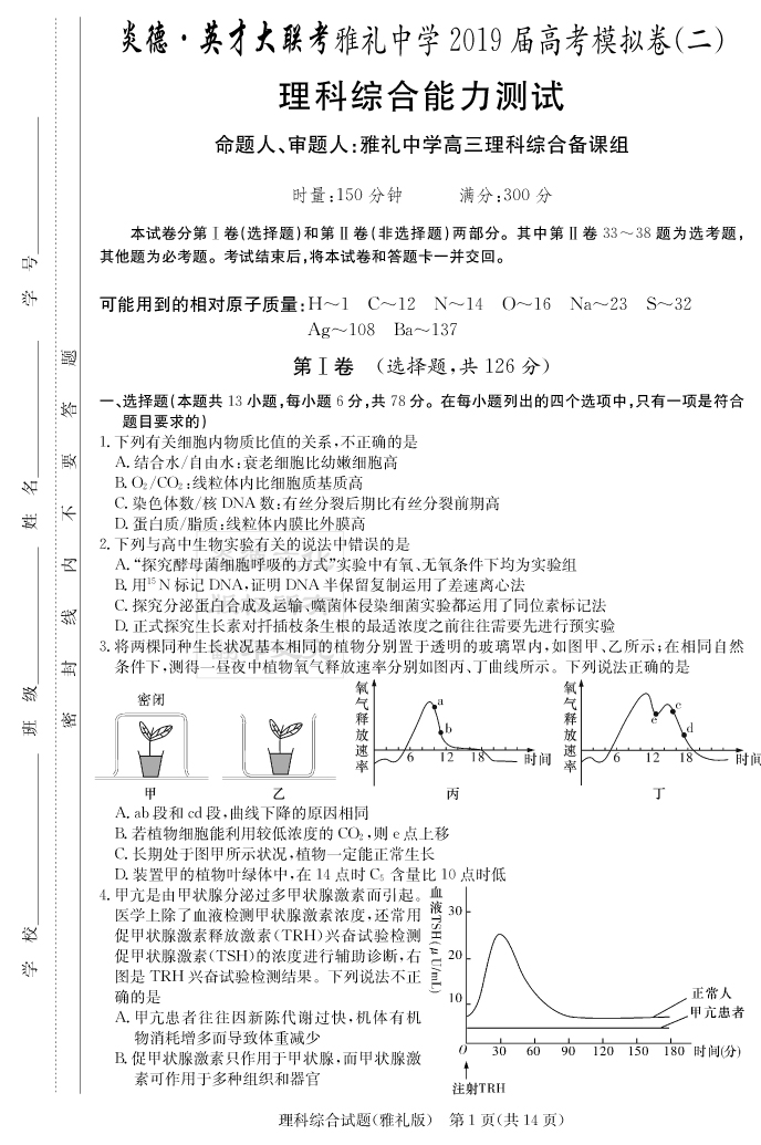 【理綜】炎德英才大聯(lián)考2019雅禮中學(xué)高三10次月考(模擬二)
