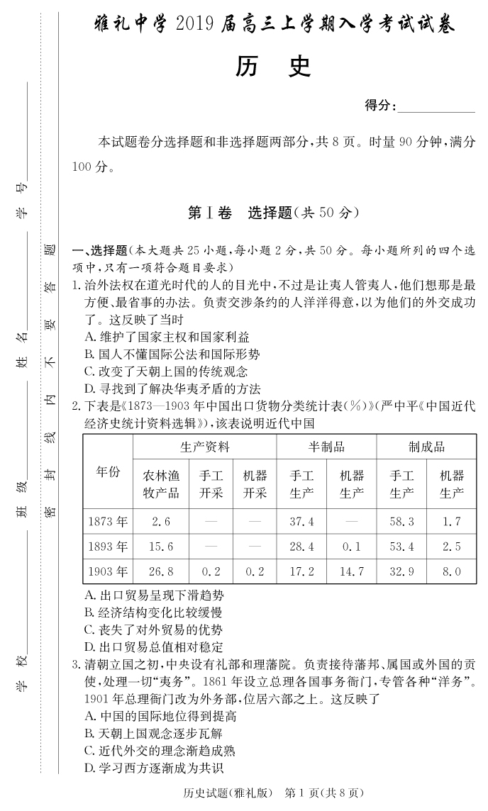 【歷史】雅禮中學(xué)2019屆高三上學(xué)期入學(xué)考試