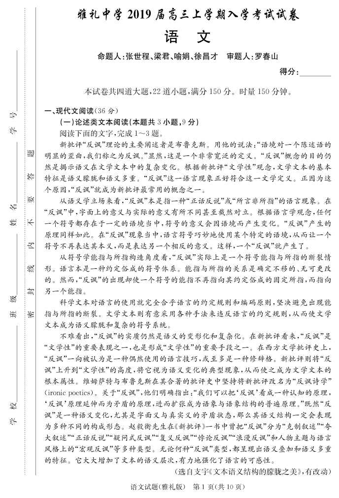 【語文】雅禮中學(xué)2019屆高三上學(xué)期入學(xué)考試