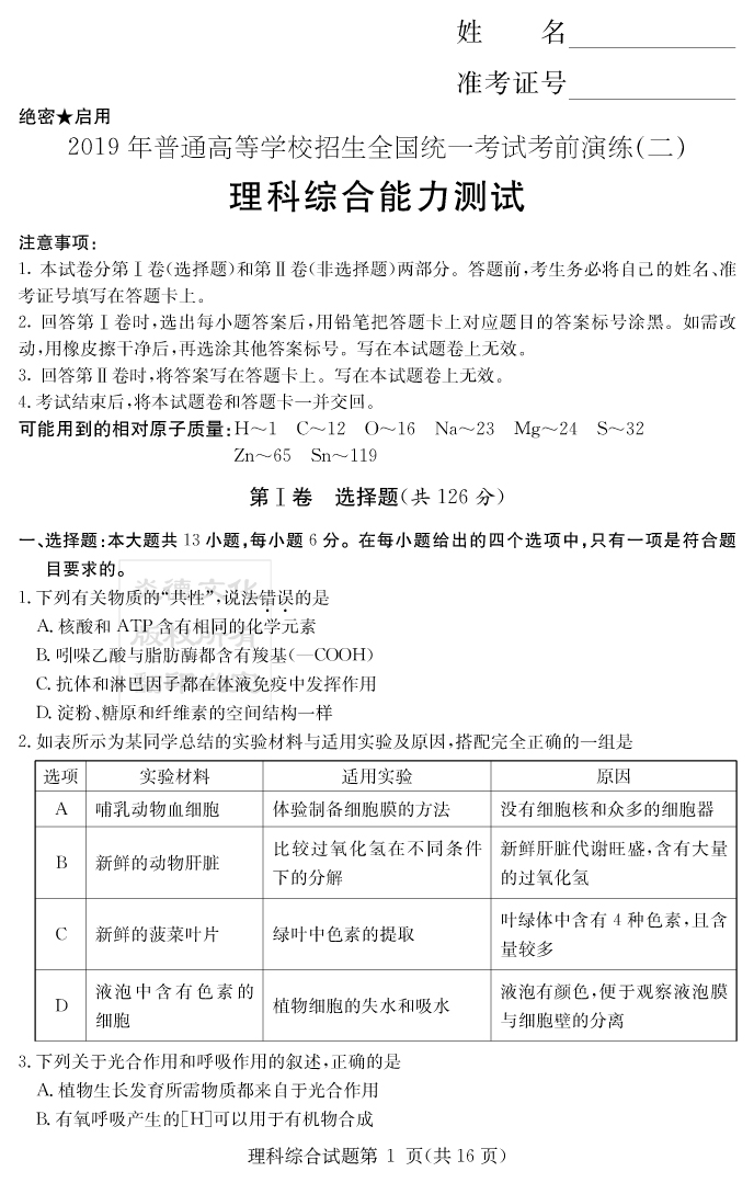 【理綜】2019年普通高等學(xué)校招生全國(guó)統(tǒng)一考試考前演練(二)