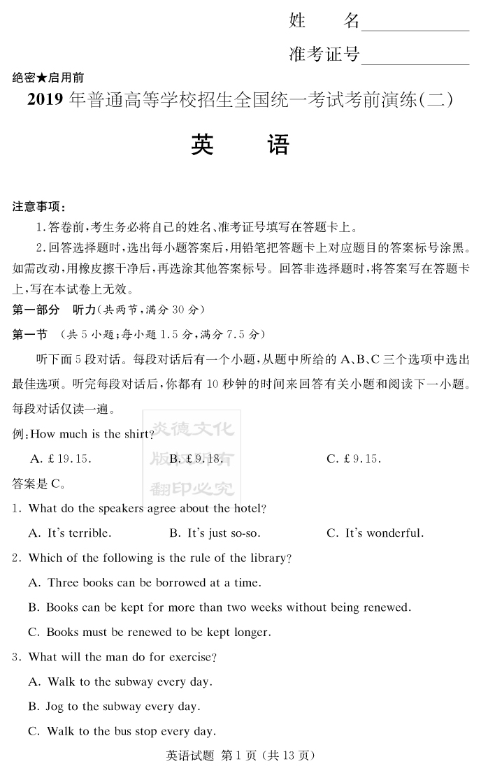 【英語(yǔ)】2019年普通高等學(xué)校招生全國(guó)統(tǒng)一考試考前演練(二)