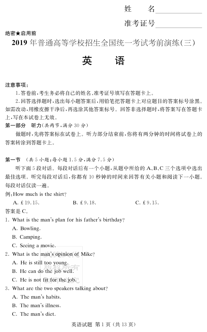 下一篇:【語文】2019年普通高等學校招生全國統(tǒng)一考試考前演練(三)