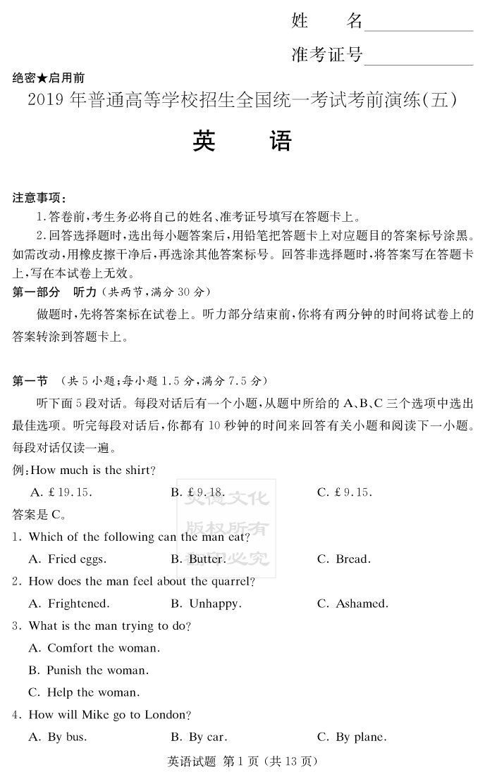 【英語】2019年普通高等學(xué)校招生全國統(tǒng)一考試考前演練(五)